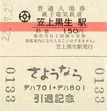 | 平成22年9月23日デハ701・デハ801引退記念入場券(笠上黒生駅) |