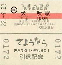 | 平成22年9月23日デハ701・デハ801引退記念入場券(犬吠駅) |