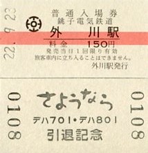 | 平成22年9月23日デハ701・デハ801引退記念入場券(外川駅) |