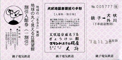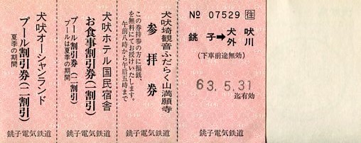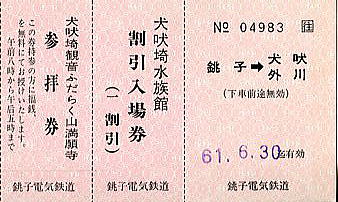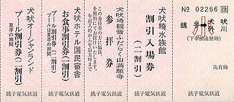 | ※乗車券部分がないため、発売時期は不明ですが、券の色や内容から上のクーポン券に近いように思います。平成の初期でしょうか。「犬吠埼水族館」が「犬吠埼マリンパーク」になっています。また、「ぬれ煎餅」が入っていますが、割引券ではないようです。 | ||