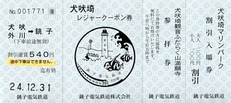 | 犬吠埼レジャークーポン券は、銚子駅と犬吠駅・外川駅間の往復乗車券です。 |
