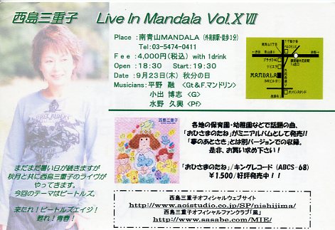 | 備 考 : ビートルズ特集 「ばくのひとりごと」から ビートルズ特集は、「レット・イット・ビー」を中心にスローテンポな曲が多かったです。西島さんご自身の曲は、ポール関連ということで、アルバム『IMAGE』から「サウスポー・ベースマン」。テイチク時代の曲は最近聴いていませんでしたが、『定番ベスト』で改めて聞き直してみると、若々しくてよい歌が多いですね。ぜひオリジナルアルバムのCD化をお願いしたいです。 西島さんは秋の花粉症とかで苦しそうでした。少なくとも、歌っている間は全面禁煙にしたいですね。 |