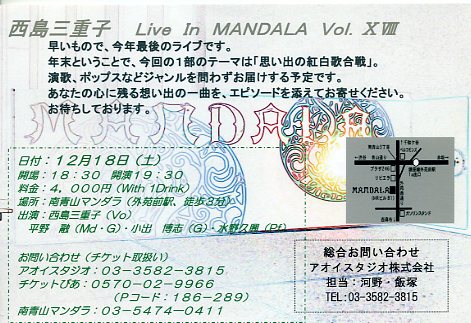 | 備 考 : 紅白歌合戦特集 「ばくのひとりごと」から 18日のライブ行ってきました。紅白歌合戦特集もそれなりによかったのですが、第二部のオリジナル曲が最高でした。特に「ドゴール・パーク」「やさしくなれる季節だから」の2曲は感動しました。「ドゴール・パーク」はテイチク時代、「やさしくなれる季節だから」は最新のメディアリング時代の曲です。 |