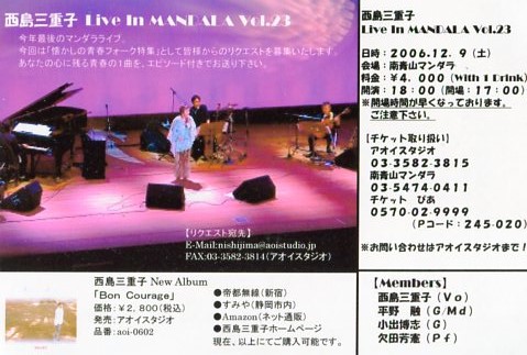 | 第一部 1.ケンとメリー〜愛と風のように〜(BUZZ) 2.サルビアの花(もとまろ) 3.なごり雪(伊勢正三) 4.海を見ていた午後(荒井由実) 5.22才の別れ(風) 6.池上線(「風車」) 7.いちご白書をもう一度(BANBAN) 8.酒と涙と男と女(河島英五) 9.異邦人(久保田早紀) 第二部 10.ミッドナイトララバイ(「シルエット」) 11.ジンライム(「さめないうちに・・・」) 12.シベールの日曜日(「水色の季節の風」) 13.青春のシュプレヒコール(「Bon Courage」) 14.DEAR MY FRIEND(「夢のあとさき」) 15.おひさまのたね(「夢のあとさき」) 16.プレゼント〜I'm proud of you〜(「Bon Courage」) 17.Bon Courage〜が・ん・ば・れ〜(「Bon Courage」) 18.星屑のララバイ(「Bon Courage」) アンコール 19.やさしくなれる季節だから(「つまんないものよ、私の心」) 20.ホワイトクリスマス |