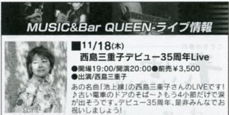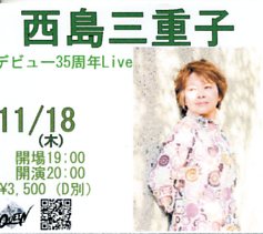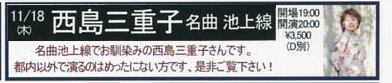 | 第一部 1.青春のシュプレヒコール(「Bon Courage(ボン・クラージュ)」) 2.ラブ・ソング(「シルエット」) 3.泣かないわ(「SHADOW」) 4.エピローグ(「SHADOW」) 5.河は流れる(for.研ナオコ) 6.おひさまのたね(「夢のあとさき」) 7.Bon Courage(「Bon Courage(ボン・クラージュ)」) 第二部 平野融さんのギター演奏 アルバム『メディカルストリングス』から「This is My Way」 8.池上線(「風車」) 9.千登勢橋(「シルエット」) 10.SHADOW(「SHADOW」) 11.縁日(新曲) 12.百万本のバラ(加藤登紀子) 13.黄昏のビギン(水原弘〜ちあきなおみ) 14.セ・シ・ボン(西島三重子さん訳詞) 15.スターダスト(西島三重子さん訳詞) アンコール 16.仮縫い(「かもめより白い心で・・・」) ※2、3、8、9、10、11、12では西島三重子さんもギターを弾きました。 |