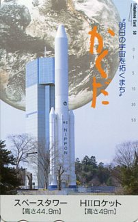 | 訪問記録等 | 平成17年(2005年)8月11日訪問。 宇宙展示館コスモハウスと併せて、「スペースタワー・コス モハウス」と呼ばれることが多いようです。 タワーに隣接してH-Uロケット実物大模型が設置されて います。こちらは高さ50メートル。 このタワーのテレホンカードの存在は確認をしていたので すが、残念ながら、平成17年には既にタワーには置いて ありませんでした。 しかし、係員の方が調べてくださり、市内にまだ扱っている お店があることが判明し、入手することが出来ました。 思い出深いテレホンカードです。 本当にありがとうございました。 |