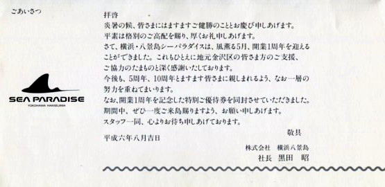 | オープン | 平成5年(1993年)5月8日 『横浜・八景島シーパラダイス』開業 | |