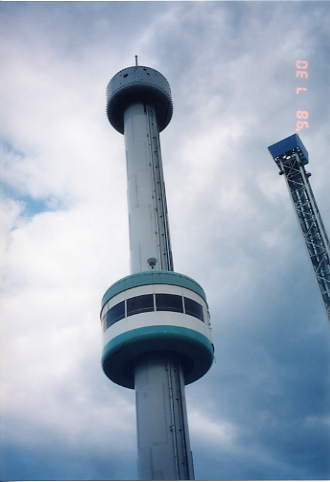 | 訪問記録等 | 平成10年(1998年)7月30日(木)訪問。 鷲羽山ハイランド内の展望タワーです。キャッチコピー にあるように瀬戸大橋の展望は抜群。 しかし、大観覧車の方が頂点は高いので、こちらもぜひ 乗ってみてください。(すきま風が怖いです) タワー・観覧車にたどり着くまで相当階段を上ります。 ホームページへのリンクを修正しました。園内マップで は展望タワーは「スカイビュー」、観覧車は「レインボー ワープ」と呼ばれていますね。(2009.8.20) スカイビューは休業中との記事を見ていたので、電話 で確認して見ました。やはり、もう数年間乳業中とのこ とでした。また一つ回転昇降式タワーがなくなってしまい ました。(2017.12.18) |